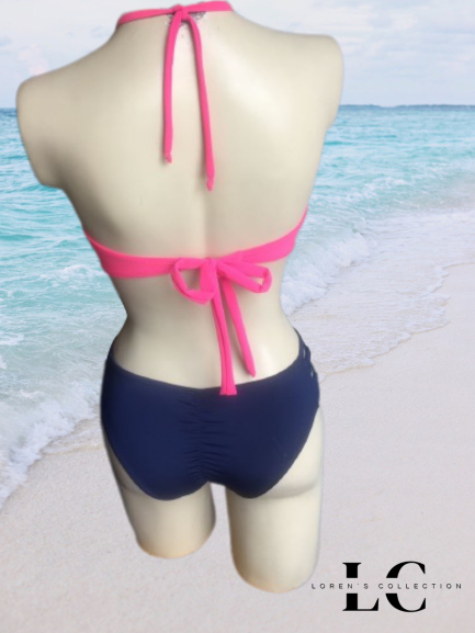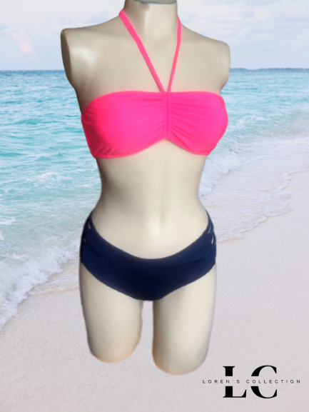Vestido de baño de dos piezas ,copas estilo bandeau, con bolsillo interno para extraer la copa, espalda graduable, con cargadera l para amarrar al cuello, panty convencional