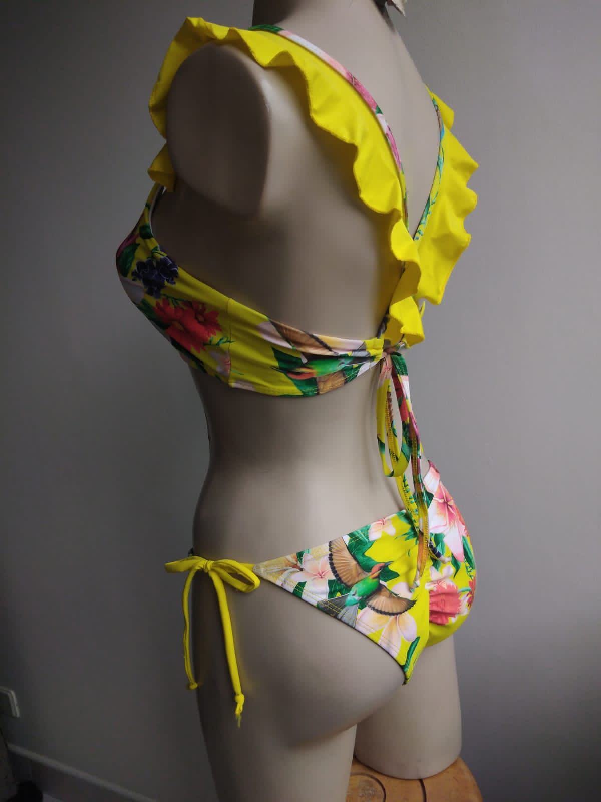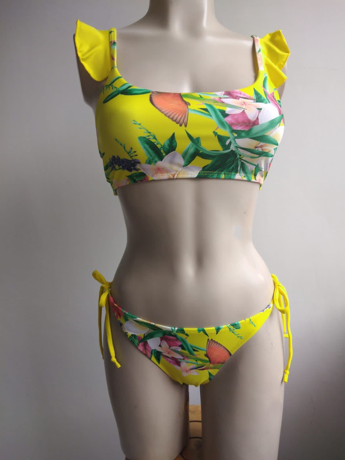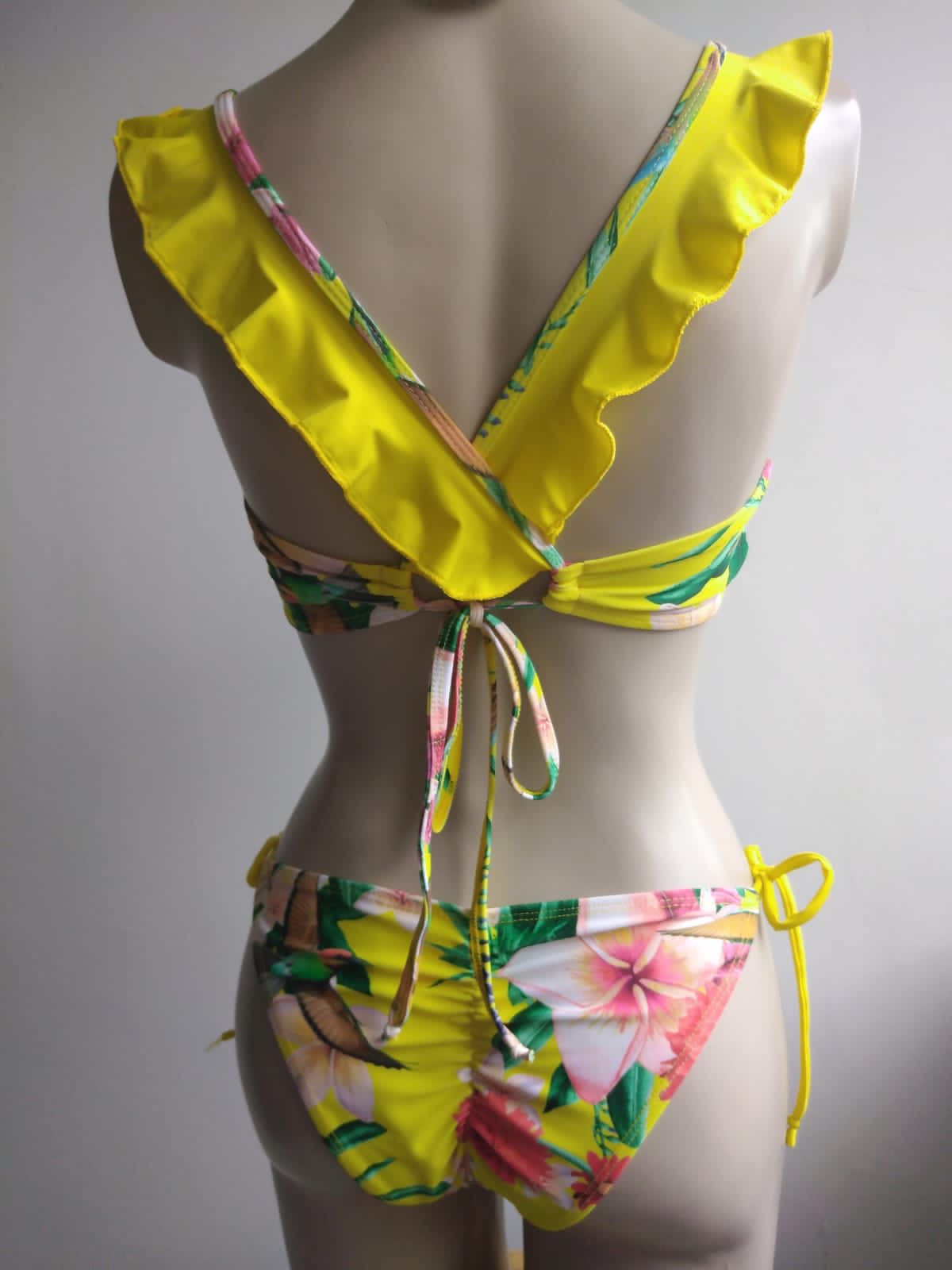 vestido de baño de dos piezas: top con elastico en la base del busto para mayor soporte y mejor modelacion, copas removibles, cargaderas con boleros que se prolongan hacia la espalda y permiten ajustar la prenda hasta donde desees, panty tipo tanga semid