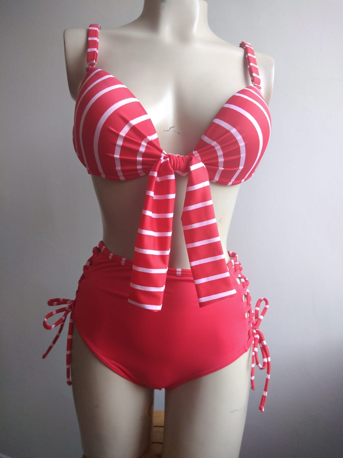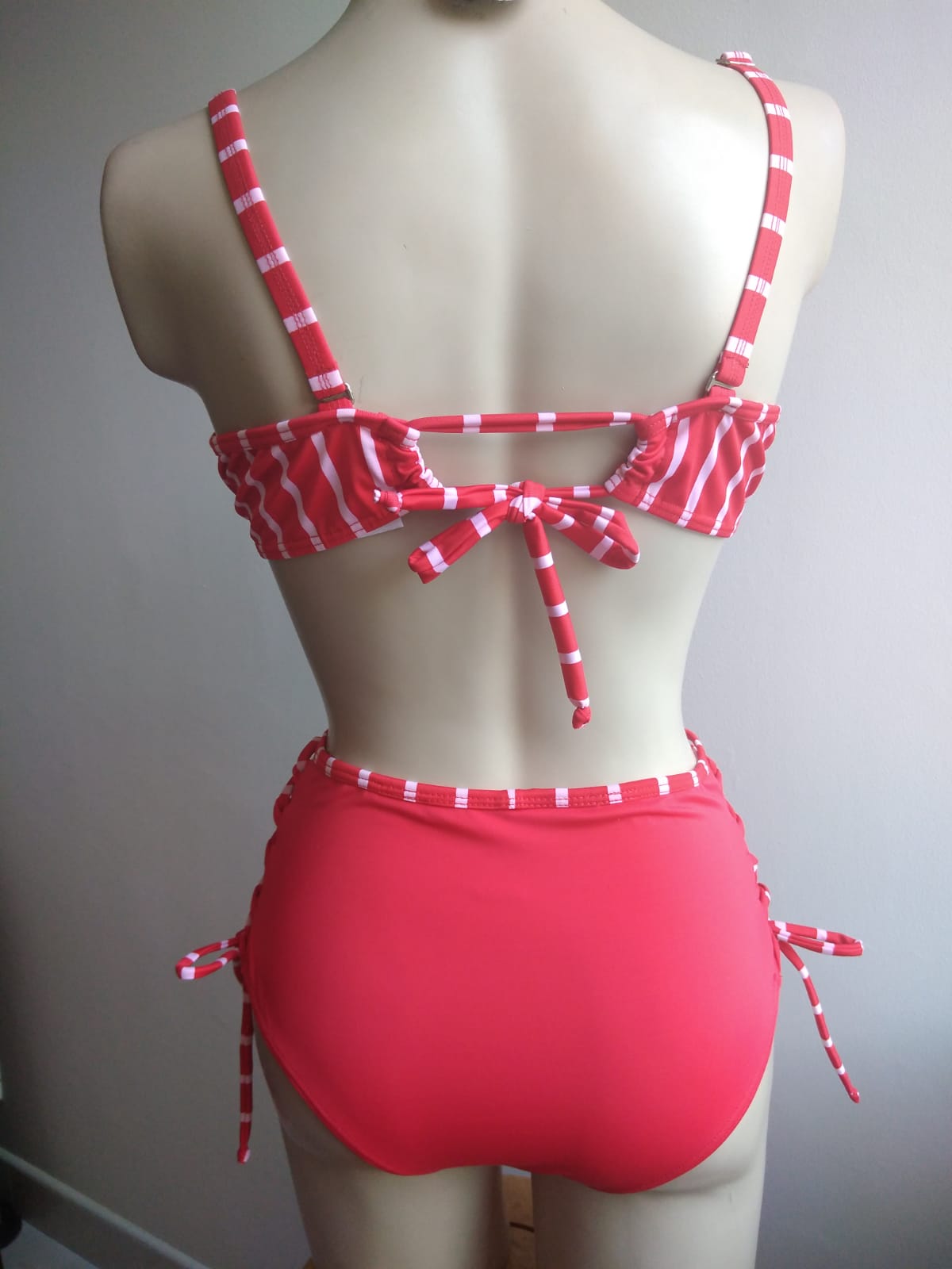 Vestido de baño de dos piezas , top con silueta bandeau, copas removibles suaves y ligeras o con copa fija con realce natural, panty con dos tipos de siluetas, tipo panty con realce en la parte trasera o tipo cachetero con tiras ajustables a los lados